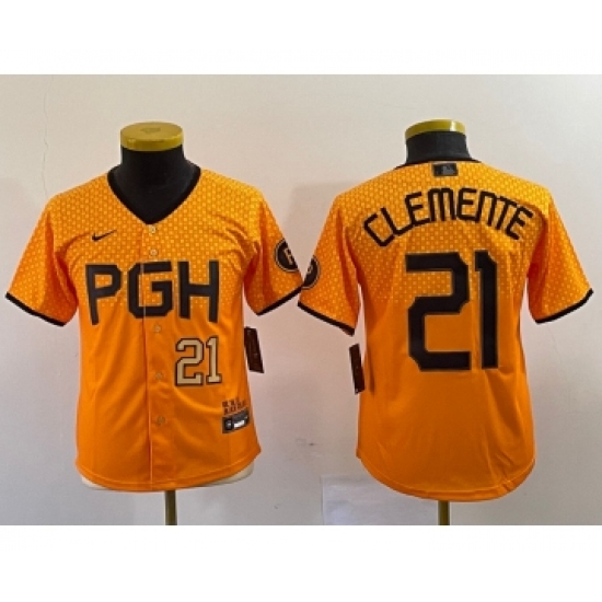 Youth Nike Pittsburgh Pirates #21 Roberto Clemente Number Yellow 2023 City Connect Stitched Jersey1