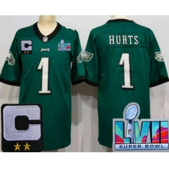 >Youth Philadelphia Eagles #1 Jalen Hurts Limited Green C Patch Super Bowl LVII Vapor Jersey