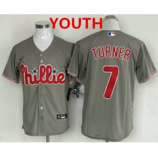 >Youth Philadelphia Phillies #7 Trea Turner Grey Cool Base Stitched Baseball Jersey