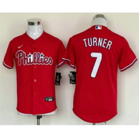 >Youth Philadelphia Phillies #7 Trea Turner Red Cool Base Stitched Baseball Jersey