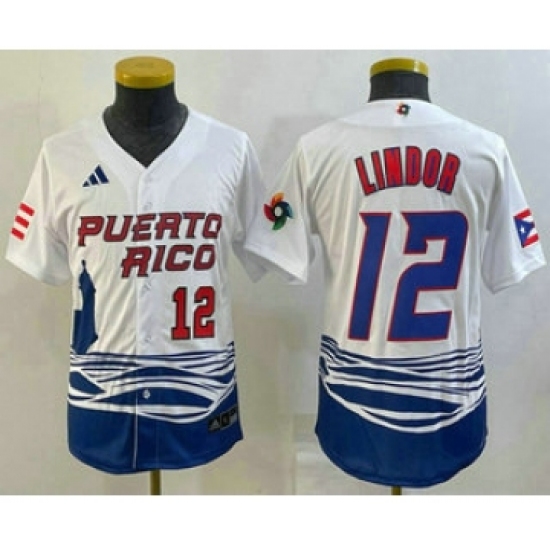 Youth Puerto Rico Baseball #12 Francisco Lindor Number 2023 White World Baseball Classic Stitched Jersey