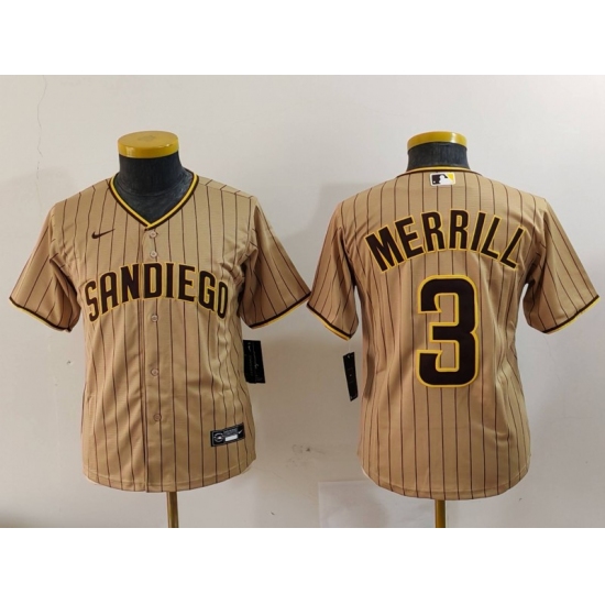 >Youth San Diego Padres #3 Jackson Merrill Tan 2023 Cool Base Stitched Jersey