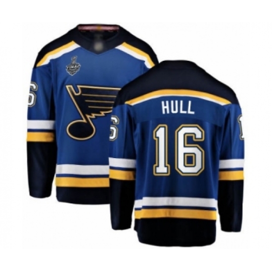>Youth St. Louis Blues #16 Brett Hull Fanatics Branded Royal Blue Home Breakaway 2019 Stanley Cup Final Bound Hockey Jersey