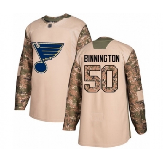 >Youth St. Louis Blues #50 Jordan Binnington Authentic Camo Veterans Day Practice Hockey Jersey