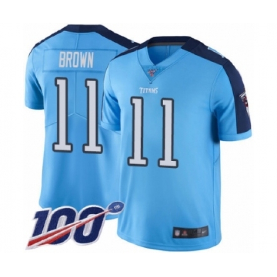 >Youth Tennessee Titans #11 A.J. Brown Limited Light Blue Rush Vapor Untouchable 100th Season Football Jersey