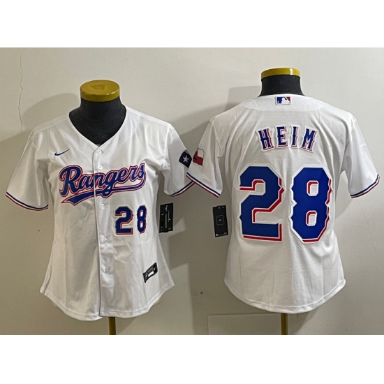 >Youth Texas Rangers #28 Jonah Heim Number White 2023 World Series Champions Cool Base Jersey