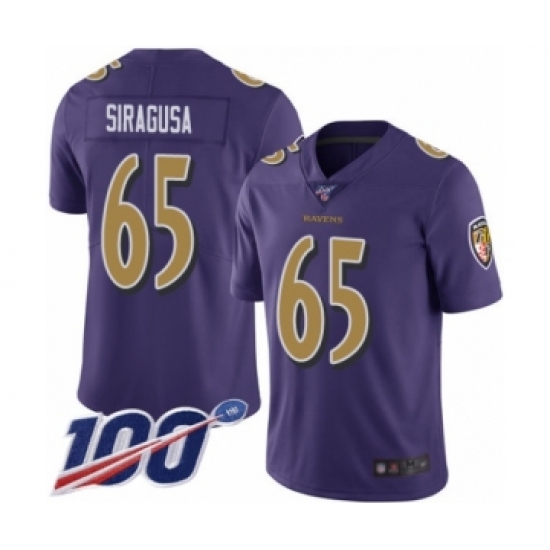 >Men's Baltimore Ravens #65 Nico Siragusa Limited Purple Rush Vapor Untouchable 100th Season Football Jersey