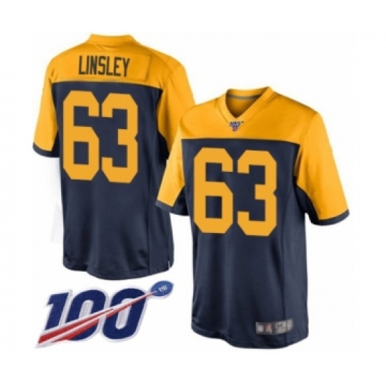 >Men's Green Bay Packers #63 Corey Linsley Limited Navy Blue Alternate 100th Season Football Jersey