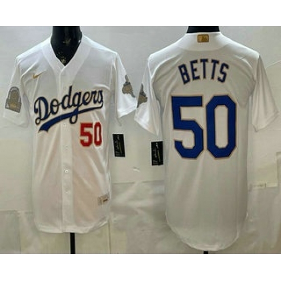 Men's Los Angeles Dodgers #50 Mookie Betts White Gold World Series Champions Collection Limited Jersey