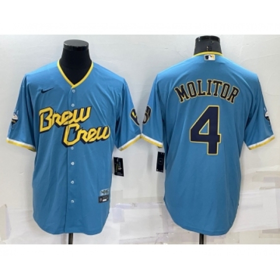 Men's Milwaukee Brewers #4 Paul Molitor Blue 2022 City Connect Cool Base Stitched Jersey