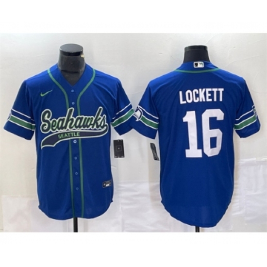 >Men's Seattle Seahawks #16 Tyler Lockett Royal Throwback Cool Base Stitched Baseball Jersey