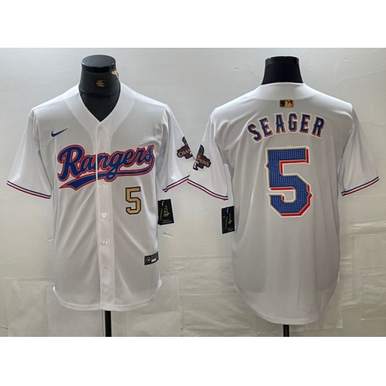 >Men's Texas Rangers #5 Corey Seager Number White 2023 World Series Champions Cool Base Jerseys