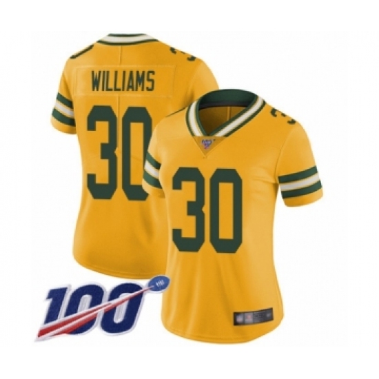 >Women's Green Bay Packers #30 Jamaal Williams Limited Gold Rush Vapor Untouchable 100th Season Football Jersey