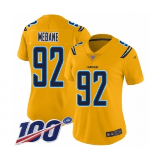 >Women's Los Angeles Chargers #92 Brandon Mebane Limited Gold Inverted Legend 100th Season Football Jersey