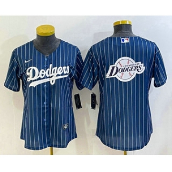 >Women's Los Angeles Dodgers Big Logo Navy Blue Pinstripe Stitched MLB Cool Base Nike Jersey