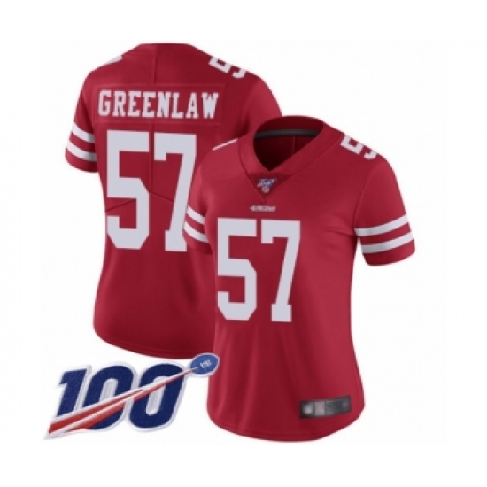 >Women's San Francisco 49ers #57 Dre Greenlaw Red Team Color Vapor Untouchable Limited Player 100th Season Football Jersey