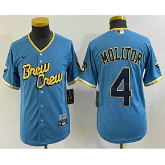 >Youth Milwaukee Brewers #4 Paul Molitor Blue 2022 City Connect Cool Base Stitched Jersey
