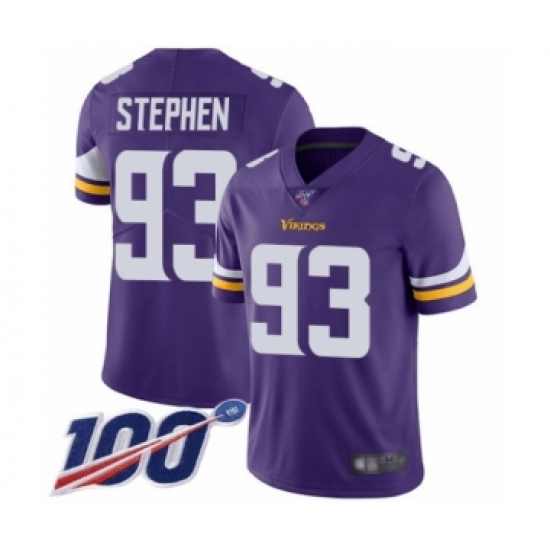 >Youth Minnesota Vikings #93 Shamar Stephen Purple Team Color Vapor Untouchable Limited Player 100th Season Football Jersey