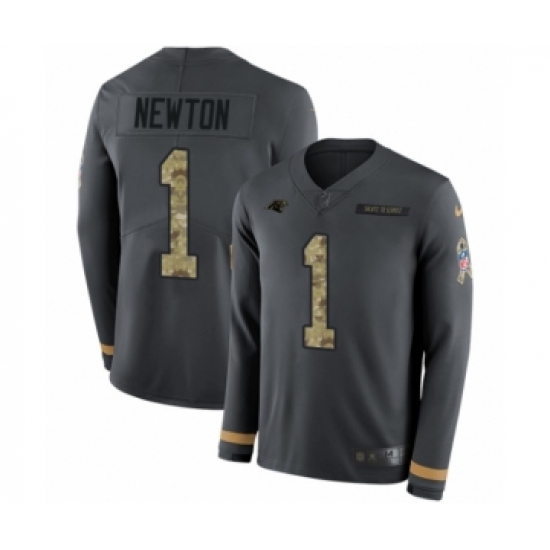 Youth Nike Carolina Panthers #1 Cam Newton Limited Black Salute to Service Therma Long Sleeve NFL Jersey